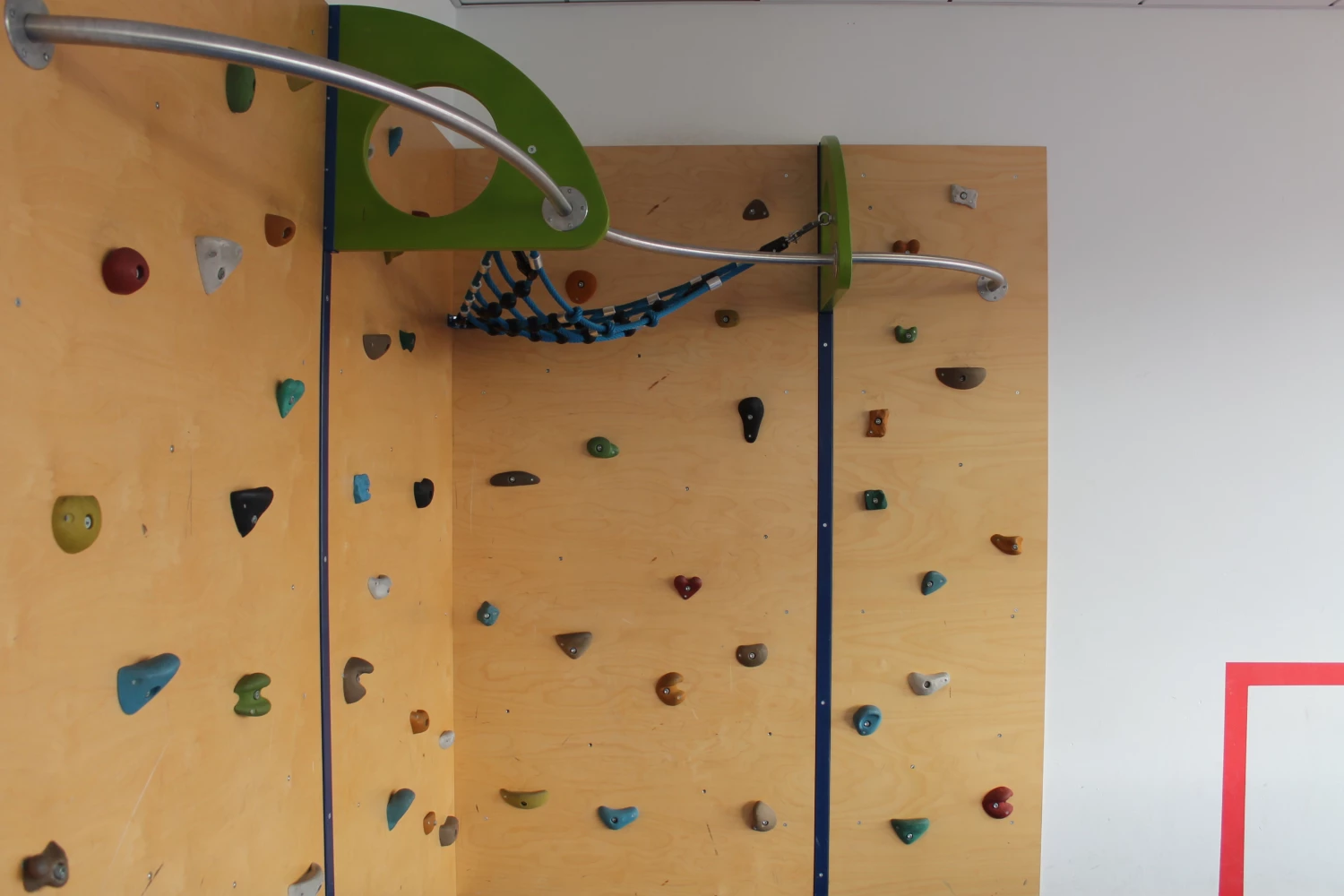 Die Gruppen A und B haben identische Räume zur Verfügung: Jeweils einen Gruppenraum mit Kreativ- und Konstruktionsmaterial, Garderoben mit Stauraum, einen Bewegungsraum mit Kletterwand, Kicker und Bälle-Bad und einen Ruheraum zum Lesen, entspannen, Lego bauen, Spiele spielen und basteln. Außerdem noch zwei separate Klassenzimmer für die Erledigung der Hausaufgaben und eine Mensa für warmes Mittagessen. Die Räumlichkeiten der Schule, wie z.B. Turnhalle mit Schnitzelgrube und Aula dürfen zu bestimmten Zeiten mitbenutzt werden.