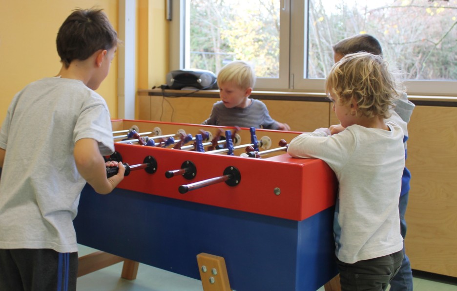 Die Gruppen A und B haben identische Räume zur Verfügung: Jeweils einen Gruppenraum mit Kreativ- und Konstruktionsmaterial, Garderoben mit Stauraum, einen Bewegungsraum mit Kletterwand, Kicker und Bälle-Bad und einen Ruheraum zum Lesen, entspannen, Lego bauen, Spiele spielen und basteln. Außerdem noch zwei separate Klassenzimmer für die Erledigung der Hausaufgaben und eine Mensa für warmes Mittagessen. Die Räumlichkeiten der Schule, wie z.B. Turnhalle mit Schnitzelgrube und Aula dürfen zu bestimmten Zeiten mitbenutzt werden.