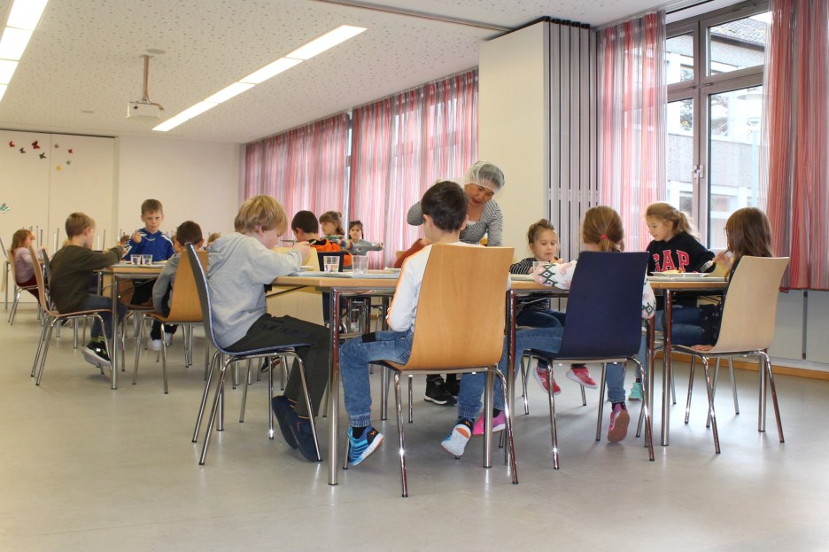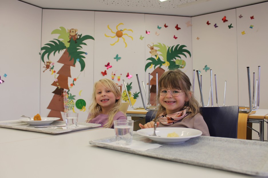 Das Mittagessen in der Mensa kann bei der Anmeldung gebucht werden, es besteht aber auch die Möglichkeit selbst Essen mitzubringen und in den Gruppenräumen zu essen. Die Essenszeiten sind ca. ab 12 Uhr bis 13.30 Uhr.